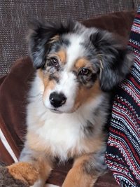 Wir haben unsere Akira jetzt seit 4 ½ Monaten. Wenn sie 8 Monate alt ist soll sie mit ihrer Assistenzausbildung beginnen. Doch sie macht jetzt schon vieles, was sie eigentlich erst lernen sollte. Sie unterbricht z.B. dissoziative Zustände, indem sie versucht Kontakt zu uns herzustellen. Dabei verssucht sie zuerst unsere Hand zu lecken. Wenn das nicht reicht, springt sie auf uns drauf, wenn wir sitzen auf unseren Schoß und wenn wir liegen legt sie sich auf uns drauf. Anschließend versucht sie uns zum Spielen zu animieren, damit wir abgelenkt sind. Sie begleitet uns immer, wenn wir das Haus verlassen und wenn wir Bus oder Bahn fahren setzt sie sich zwischen unsere Beine und schafft so Distanz zu anderen Fahrgästen. Wenn uns dennoch jemand zu nahe kommt, steht sie auf und stellt sich dazwischen. So schafft sie uns sogar in vollen Zügen etwas Spielraum. Sie meldet Besucher durch kurzes Bellen an, bevor die klingeln und steht immer vor uns, wenn wir dann die Tür aufmachen müssen. Sie gibt uns sehr viel Sicherheit, schon alleine weil sich niemand mehr unbemerkt nähern kann, aber auch weil sie schon jetzt unsere Grenzen Fremden gegenüber aufzeigt. Wir bewegen uns dadurch draußen viel freier und mit weniger Angst.